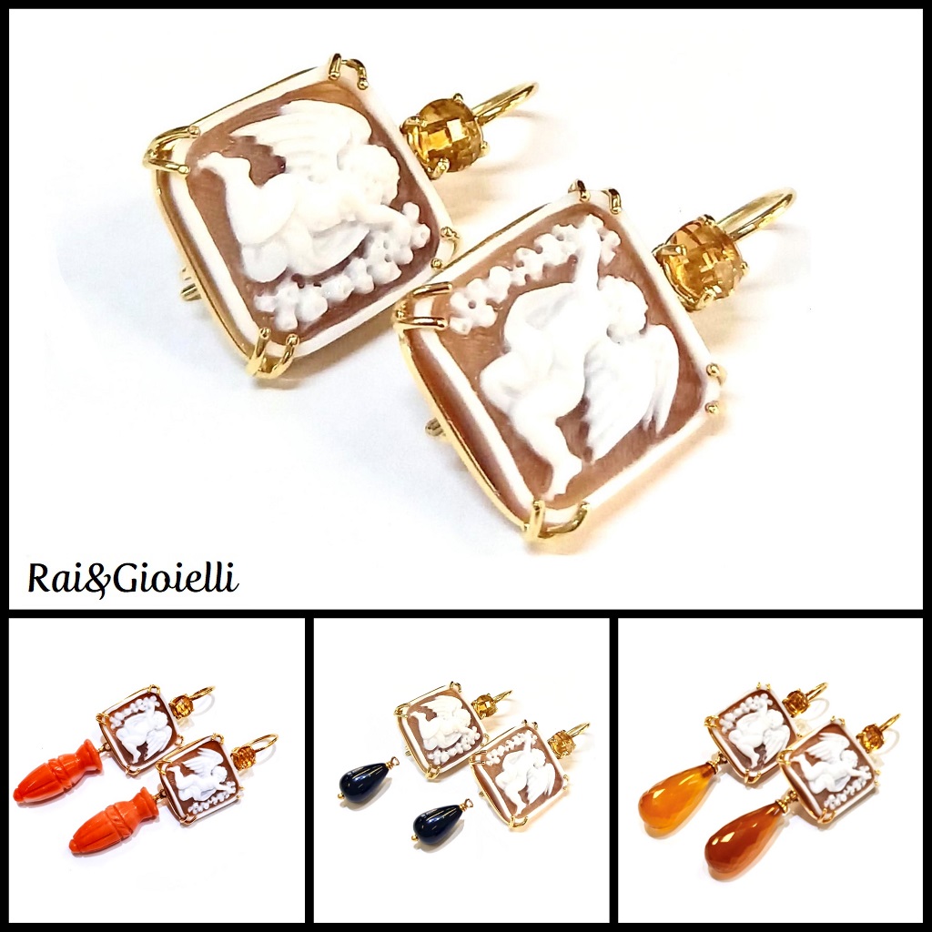 Tra le novita' nella vetrina Rai&Gioielli, ecco a voi la nuovissima ed originalissima Collezione Cammeo, la linea di orecchini dalle pietre intercambiabili! Alla base degli orecchini con cammeo montato su oro giallo 18kt possono essere agganciate a scelta pietre semipreziose a goccia o perle di vari colori e tonalita', cosi da avere orecchini ogni giorno nuovi e perfetti su ogni outfit! Per uno stile piu' semplice e classico, la base in cammeo degli orecchini puo' anche essere lasciata a se stante. Puoi ammirare la Collezione Cammeo anche sulle nostre pagine social e acquistare sul